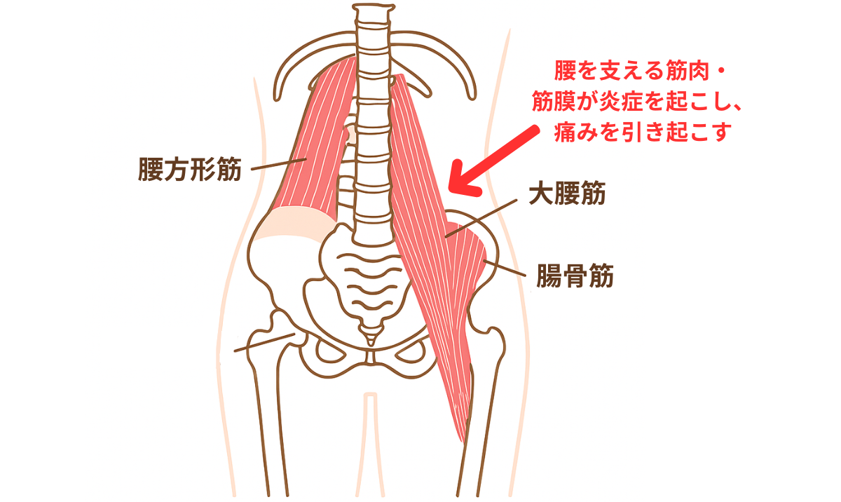 筋・筋膜性腰痛は、腰の筋肉やそれを包む筋膜が傷ついたり、緊張することで起こる腰痛です。
