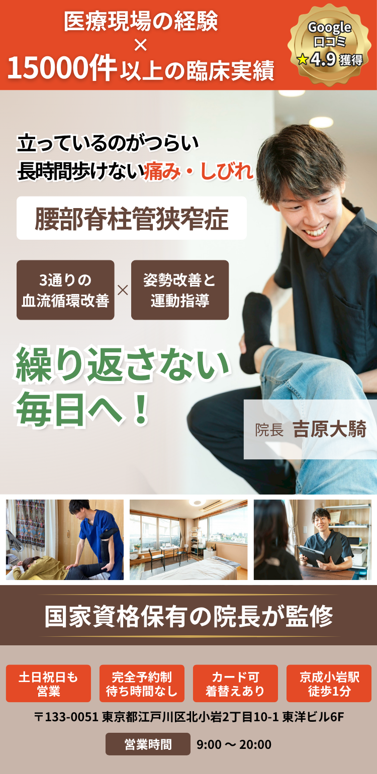 腰部​脊柱管狭窄症は、​背骨の​中を​通る​脊柱管​(神経が​通る​トンネル)が​狭くなる​ことで、​神経や​血管が​圧迫され、​下肢や​腰に​症状が​出る​病気です。​